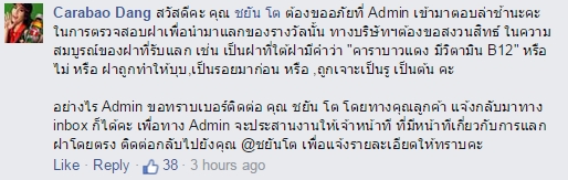โดยล่าสุด ทางแอดมินเพจ Carabao Dang ก็ได้เข้ามาคอมเม้นท์ชี้แจงเกี่ยวกับเรื่องที่เกิดขึ้นแล้ว โดยระบุว่า ในการตรวจสอบฝาเพื่อนำมาแลกของรางวัลนั้น ทางบริษัทฯ ต้องขอสงวนสิทธ์ ในความสมบูรณ์ของฝาที่รับแลก เช่น เป็นฝาที่ใต้ฝามีคำว่า "คาราบาวแดง มีวิตามิน B12" หรือไม่ หรือ ฝาถูกทำให้บุบ, เป็นรอยมาก่อน หรือ ถูกเจาะเป็นรู เป็นต้น พร้อมขอเบอร์ติดต่อของคุณชยัน โต เพื่อประสานให้ทางเจ้าหน้าที่ที่เกี่ยวข้อง ติดต่อกลับเพื่อแจ้งรายละเอียดให้ทราบต่อไป