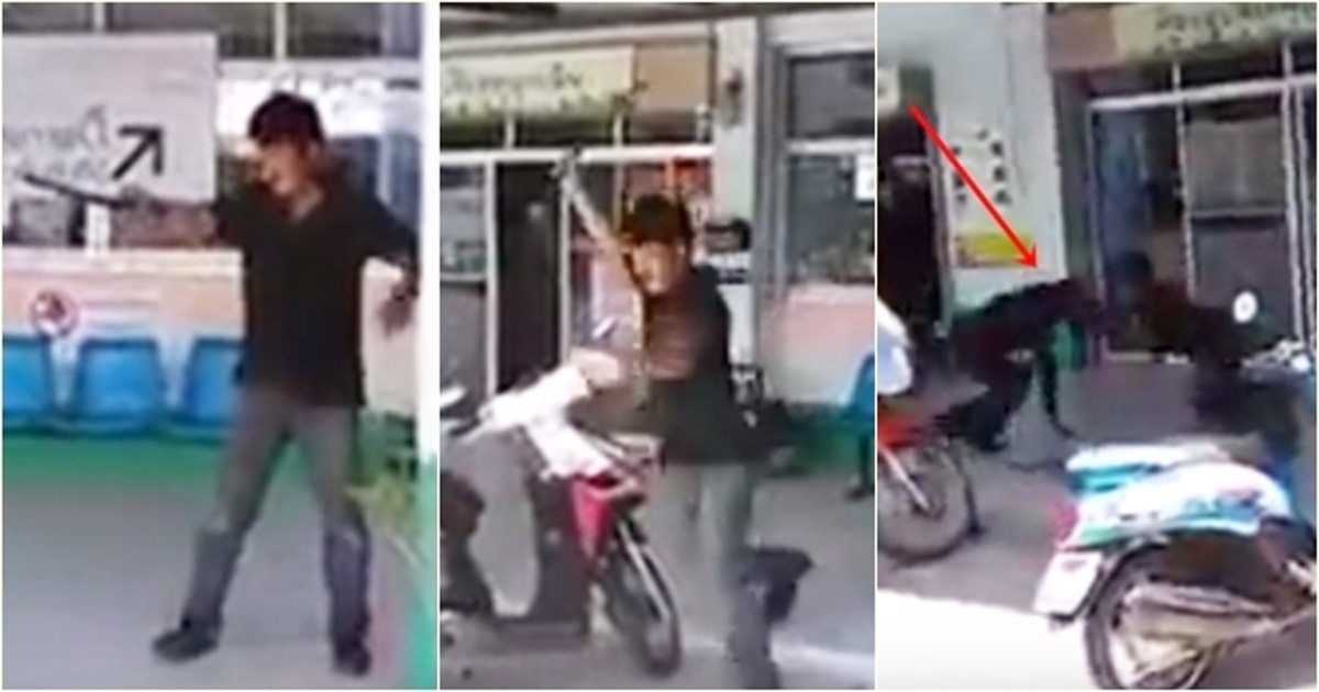 โดยเหตุการณ์นี้ คุณอุทัย ชูตระกูล ได้โพสต์คลิปให้เราดูกัน เมื่อวันที่ 24 สิงหาคม 2558 บันทึกภาพของหนุ่มเพี้ยนคนหนึ่ง ถือดาบแกว่งไปแกว่งมา เขย่าประตูอย่างแรง และตะโกนว่าเอายามา ๆ งานนี้เจ้าหน้าที่ตำรวจได้เข้าระงับเหตุ แต่ก็เป็นไปด้วยความยากลำบาก เพราะหนุ่มเพี้ยนคนนั้นไม่ฟัง แถมยังง้างดาบจะฟันเจ้าหน้าที่ตำรวจด้วย