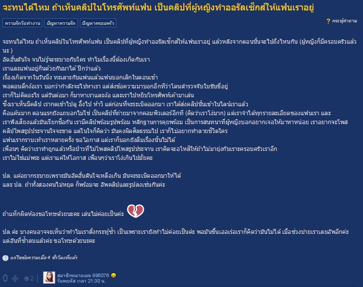 ล่าสุด วันที่ 28 สิงหาคม 2558 ในโลกของสังคมออนไลน์มีการแชร์ข้อความที่เป็นที่พูดถึงอย่างมาก เมื่อคุณ สมาชิกหมายเลข 996076 สมาชิกเว็บไซต์พันทิป ได้มีการออกมาตั้งกระทู้ "จะทนได้ไหม ถ้าเห็นคลิปในโทรศัพท์แฟน เป็นคลิปที่ผู้หญิงทำออรัลเซ็กส์ให้แฟนเราอยู่" ซึ่งเธอเองต้องการคำปรึกษา เมื่อไปเจอกับคลิปของผู้หญิงอื่น ขณะที่กำลังทำออรัลเซ็กซ์ให้แฟนตัวเอง