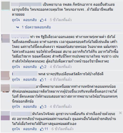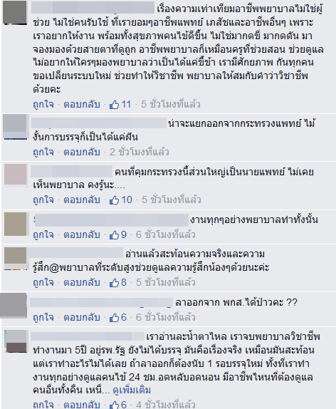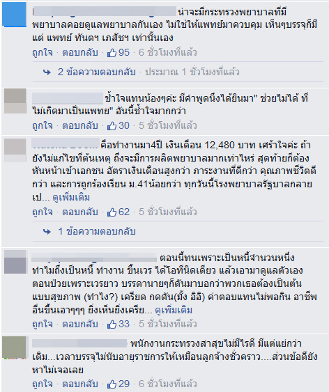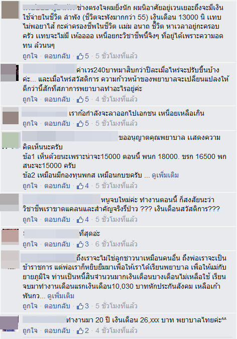 อย่างไรก็ดี ชาวเน็ตหลายคนทั้งที่เป็นพยาบาลและไม่ใช่พยาบาลก็แสดงความคิดเห็นเกี่ยวกับเรื่องนี้ บางคนทำงานมา 4 ปี เงินเดือนเพียง 1.2 หมื่นบาท บางคนบอกว่า วงการพยาบาลไม่ได้สวยหรูอย่างที่คิด แล้วอย่างนี้จะไม่ให้ไปเป็นพยาบาลของเอกชนได้อย่างไร ค่าตอบแทนน้อยมาก