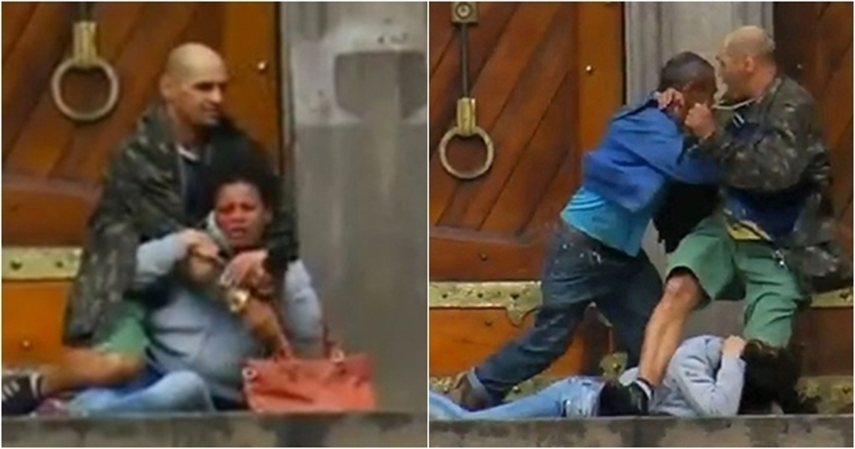 แต่แล้วระหว่างที่นายหลุยส์ แอนโตนิโอ กำลังจับตัวประกันหญิงอยู่นั้น นายฟรานซิสโก อีราสโม โรดริเกส ชายไร้บ้านวัย 61 ปี ก็ได้ตัดสินใจวิ่งเข้าไปช่วยหญิงตัวประกันอย่างกล้าหาญ เขาเข้าไปผลักนายหลุยส์ แอนโตนิโอ ที่กำลังกดร่างตัวประกันออก ทำให้หญิงตัวประกันสามารถหนีออกมาได้