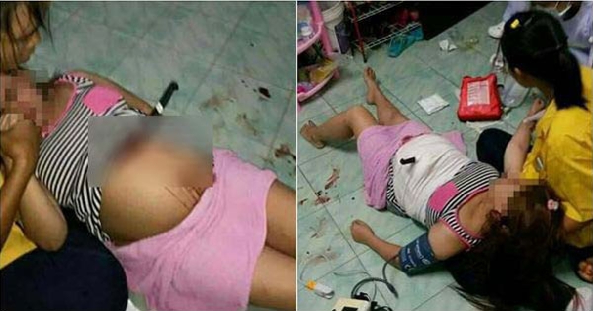 เมื่อไปถึงเจ้าหน้าที่พบหญิงท้องแก่ 7 เดือน นอนอยู่บนพื้นในสภาพมีมีดปลายแหลมปักอยู่ตรงกลางท้องของเธอ และมีเลือดไหลออกมา จึงทำการปฐมพยาบาลเบื้องต้นก่อนจะนำตัวส่งโรงพยาบาลมหาชัย 2 เป็นการด่วน