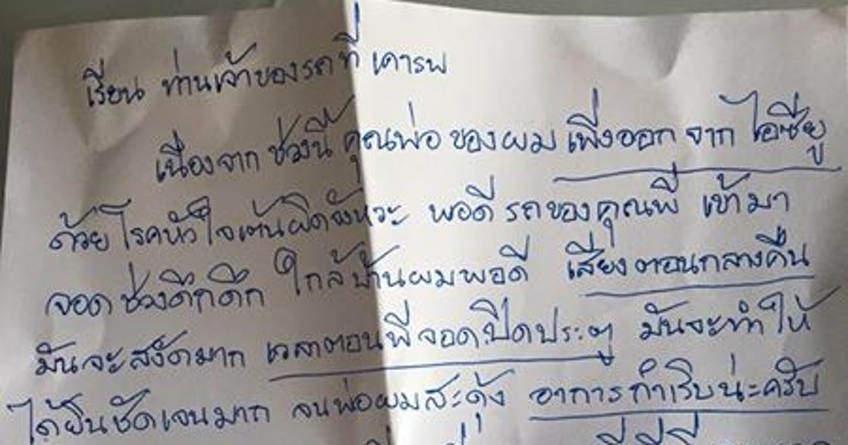 กลายมาเป็นภาพที่ถูกแชร์ต่อไปอย่างรวดเร็ว สำหรับจดหมายเตือนที่สุภาพที่สุดจนทำให้ผู้ได้รับรู้สึกผิดภาพนี้ ที่เฟซบุ๊ก Nikki Kongkapan ได้นำมาเปิดเผยในโลกออนไลน์เมื่อวานนี้ (11 กันยายน 2558) โดยระบุว่า เขาได้เจอแผ่นกระดาษแผ่นนี้เสียบไว้ตรงหน้ารถ ผู้เขียนได้เขียนเตือนมาแบบสุภาพชน ใช้เหตุผล จนเขารู้สึกผิดมาก จึงอยากจะขอโทษและขอให้คุณพ่อเจ้าของจดหมายหายป่วยไว ๆ