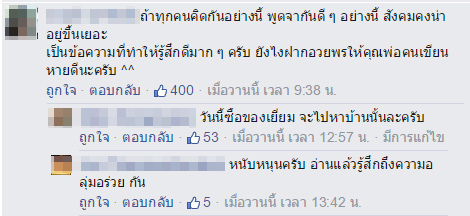 พร้อมกันนี้ยังมีคนอีกส่วนหนึ่งที่แนะนำให้เจ้าของเฟซบุ๊กดังกล่าว เข้าไปขอโทษเจ้าของจดหมายโดยตรงที่บ้าน พร้อมไปเยี่ยมอาการของคุณพ่อฝ่ายนั้นด้วย ซึ่งทางเจ้าของเฟซบุ๊กก็ได้เข้ามาเผยความตั้งใจว่าเขาได้ซื้อของเยี่ยมแล้ว แต่ยังไม่ทราบว่าจดหมายนี้มาจากบ้านหลังใด แต่จะไปตามหาหลังจากนี้
