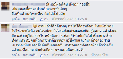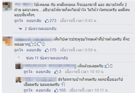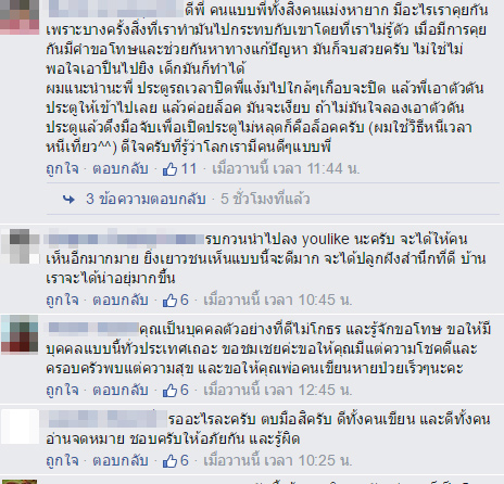 ทั้งนี้เมื่อภาพดังกล่าวได้ถูกแชร์ออกไป ก็มีคนเข้ามาร่วมแสดงความคิดเห็นกันเป็นจำนวนมาก โดยยกให้นี่เป็นหนึ่งในตัวอย่างดี ๆ ของการพูดคุยกันด้วยเหตุผล ไม่ใช้อารมณ์ หนักนิดเบาหน่อยก็อภัยให้แก่กัน จึงเป็นที่น่าชื่นชมทั้งสองฝ่าย โดยเฉพาะฝ่ายที่ถูกเตือนซึ่งนอกจากจะมีความเข้าใจ ไม่โกรธเคืองที่ถูกเตือนแล้ว ยังรู้สึกผิดจนออกมาขอโทษเช่นนี้ ซึ่งหากทุกคนคิดได้และพูดจากันดี ๆ อย่างนี้ สังคมก็คงจะน่าอยู่ขึ้นอีกเยอะ