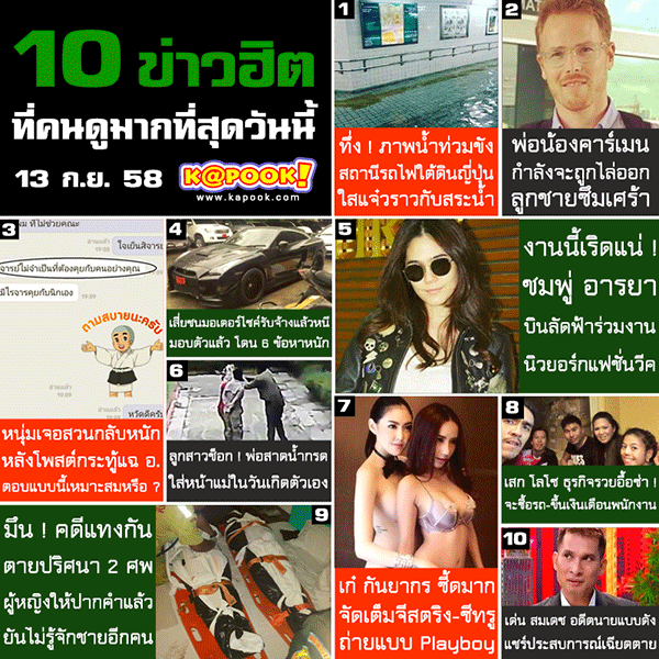 ข่าวฮิตประจำเว็บไซต์ kapook.com ประจำวันที่ 13 กันยายน 2558 ติดตามประเด็นที่กำลังเป็นที่สนใจในขณะนี้ อาทิ ความคืบหน้ากรณีพ่อน้องคาร์เมน กำลังจะถูกไล่ออก และยังกลับประเทศพร้อมลูกไม่ได้ คดีแทงกันตายปริศนา 2 ศพ พร้อมด้วยข่าวบันเทิงสุดแซบ และอื่น ๆ อีกมากมาย