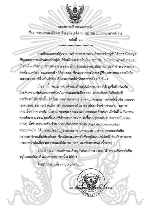 วันที่ 13 กันยายน 2558 ผู้สื่อข่าวรายงานว่า สำนักพระราชวังได้ออกแถลงการณ์ ฉบับที่ 16 เรื่อง พระบาทสมเด็จพระเจ้าอยู่หัว เสด็จฯ มาประทับ ณ โรงพยาบาลศิริราช โดยข้อความในแถลงการณ์ฉบับนี้ระบุว่า...