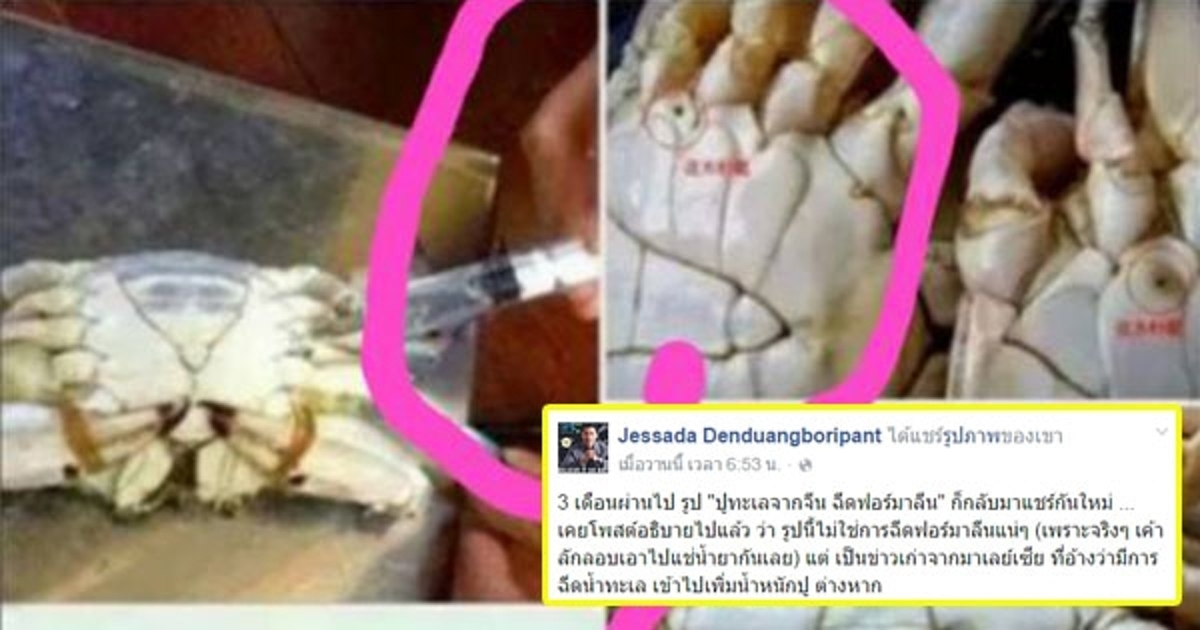 อ.เจษฎา เด่นดวงบริพันธ์ แจงภาพปูมีรูที่ท้องเพราะฉีดฟอร์มาลิน เป็นข่าวมั่วและเป็นข่าวเก่า ถูกแชร์ซ้ำหลายครั้ง ชี้เป็นข่าวจากมาเลเซียฉีดน้ำทะเลเข้าไปเพื่อเพิ่มน้ำหนักปู