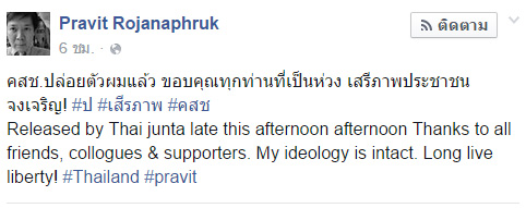 Released by Thai junta late this afternoon afternoon Thanks to all friends, collogues & supporters. My ideology is intact. Long live liberty! #Thailand #pravit