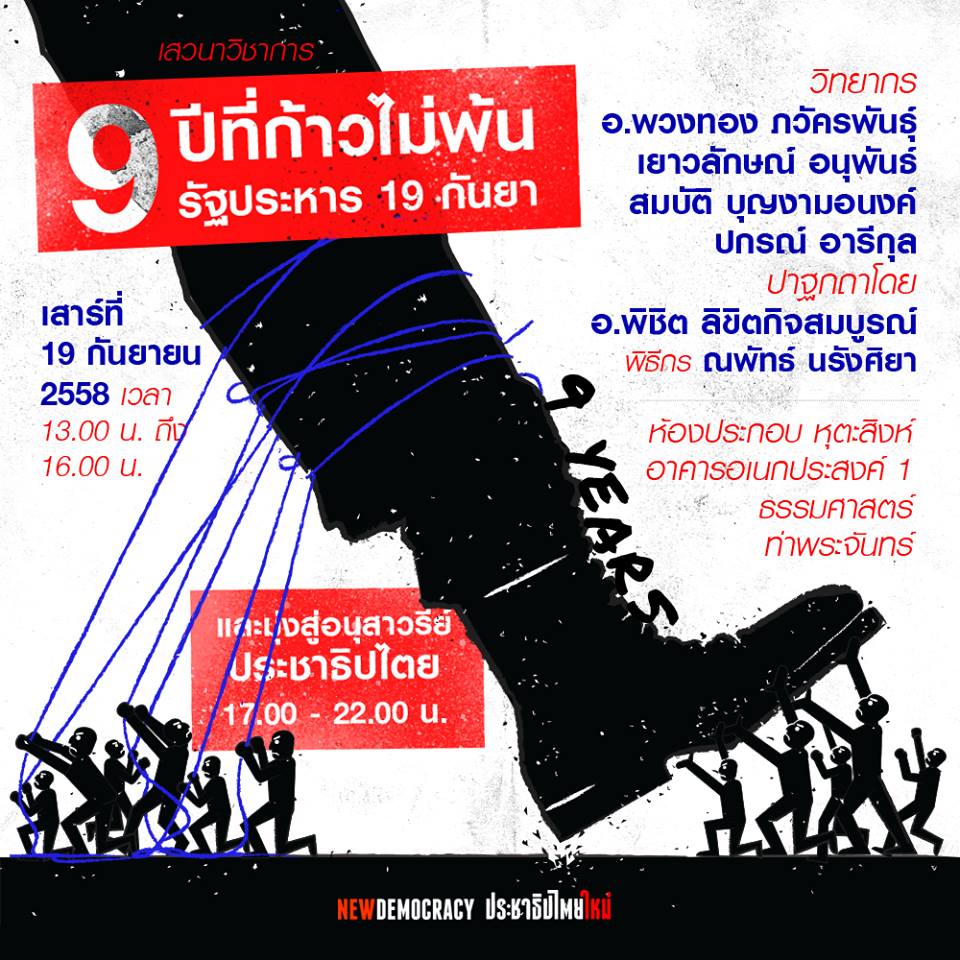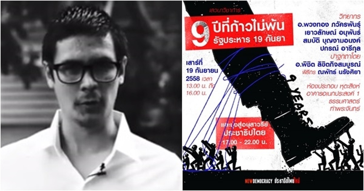 ผู้สื่อข่าวรายงานว่า เพจเฟซบุ๊ก ขบวนการประชาธิปไตยใหม่ ได้โพสต์ข้อความเชิญร่วมเสวนา "9 ปีที่ก้าวไม่พ้นรัฐประหาร 19 กันยา" โดยมี รศ.ดร. พวงทอง ภวัครพันธุ์ อาจารย์ประจำคณะรัฐศาสตร์ ภาควิชาความสัมพันธ์ระหว่างประเทศ จุฬาลงกรณ์มหาวิทยาลัย, น.ส.เยาวลักษณ์ อนุพันธ์ ทนายความจากศูนย์ทนายความเพื่อสิทธิมนุษยชน, นายสมบัติ บุญงามอนงค์ หรือ บก.ลายจุด และการจัดปาฐกถา โดยนายพิชิต ลิขิตกิจสมบูรณ์ อาจารย์ประจำคณะเศรษฐศาสตร์ มหาวิทยาลัยธรรมศาสตร์