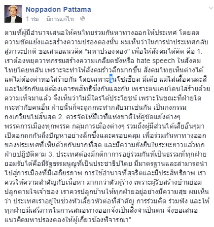 วันที่ 20 กันยายน 2558 ผู้สื่อข่าวรายงานว่า นายนพดล ปัทมะ ที่ปรึกษาด้านกฎหมายของ นายทักษิณ ชินวัตร อดีตนายกรัฐมนตรี ได้โพสต์ข้อความลงบนเฟซบุ๊กส่วนตัว "Noppadon Pattama" ระบุว่า ตนขอเสนอแนวคิด "มหาปรองดอง" 3 ข้อ
