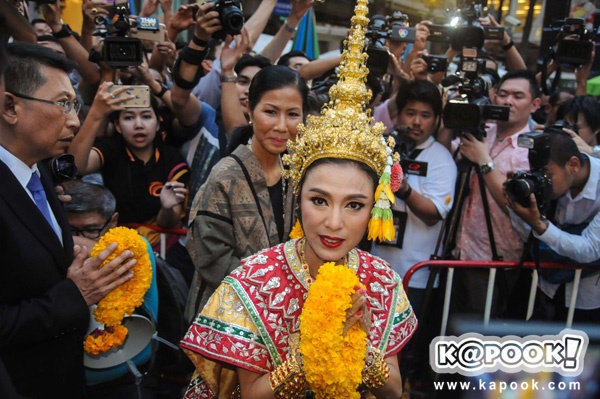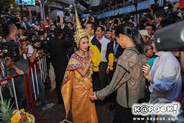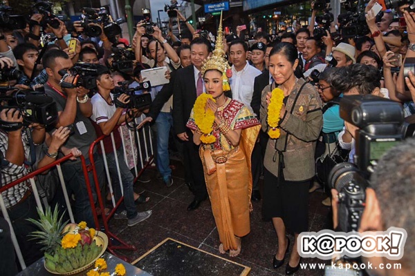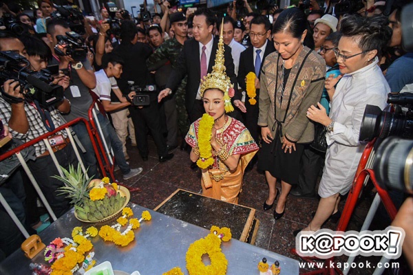 เมื่อวันที่ 22 กันยายน 2558 ณ ศาลท้าวมหาพรหมเอราวัณ สี่แยกราชประสงค์ กรุงเทพฯ นางกอบกาญจน์ วัฒนวรางกูร รัฐมนตรีว่าการกระทรวงการท่องเที่ยวและกีฬา พร้อมด้วย นายยุทธศักดิ์ สุภสร ผู้ว่าการการท่องเที่ยวแห่งประเทศไทย (ททท.) ร่วมให้การต้อนรับนักแสดงชื่อดังจากเกาะฮ่องกง "หมี เซี๊ยะ" และ "เยิ่น ต๊ะ หัว" ซึ่งได้เข้ามาสักการะพระพรหมเอราวัณ พร้อมท่องเที่ยวในกรุงเทพฯ ระหว่างวันที่ 21-24 กันยายน 2558 เพื่อเรียกคืนความเชื่อมั่นจากนักท่องเที่ยวทั้งชาวไทยและชาวต่างชาติ หมี เซี๊ยะ และ เยิ่น ต๊ะ หัว นักแสดงชื่อดังจากเกาะฮ่องกง ได้เดินทางมาถึงประเทศไทยเมื่อเย็นวานนี้ (21 กันยายน 2558) และได้เข้าสักการะพระพรหมเอราวัณ ณ สี่แยกราชประสงค์ ซึ่งเป็นสิ่งศักดิ์สิทธิ์ที่นักท่องเที่ยวทั้งชาวไทยและชาวต่างชาติเคารพนับถือ โดย หมี เซี๊ยะ ได้เข้าร่วมรำถวายเป็นการสักการะบูชาท้าวมหาพรหม พร้อมให้สัมภาษณ์แก่สื่อมวลชนไทย และต่างชาติ ถึงการเดินทางมาประเทศไทย เพื่อเป็นกำลังใจให้แก่คนไทยและเรียกความเชื่อมั่นคืนจากนักท่องเที่ยวชาวต่างชาติ