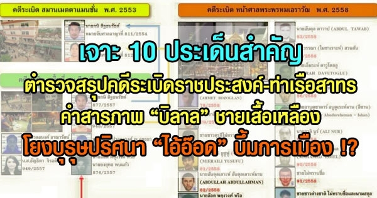 สรุป 10 ประเด็น สำนักงานตำรวจแห่งชาติ (ตร.) แถลงสรุปคดีระเบิดราชประสงค์-ท่าเรือสาทร ซึ่งเป็นเหตุให้มีผู้เสียชีวิต 20 กว่าราย ยันหลักฐานชัด "อาเดม คาราดัก" หรือ "บิลาล มูฮัมมัด" เป็นชายเสื้อเหลือง แรงจูงใจเพราะผลจากการที่ขบวนการค้ามนุษย์อุยกูร์โดนปราบหนัก นอกจากนั้น ยังพบว่า "นายอ๊อด พยุงวงศ์" ซึ่งเป็นผู้ต้องหาคดีบึ้มมีนบุรี (ปี 2557) และระเบิดสมานเมตตาแมนชั่น (ปี 2553) มีเอี่ยวด้วย ทำให้ไม่ตัดประเด็นการเมืองทิ้ง
