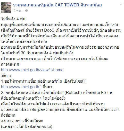 โดยในวันที่ 30 กันยายน 2558 เฟซบุ๊ก รวมพลเกมเมอร์บุกยึด CAT TOWER คืนจากม๊อบ ได้มีการเขียนข้อความเชิญชวนคนที่ค้านซิงเกิล เกตเวย์ ให้รวมตัวกันเข้าเว็บไซต์กระทรวงเทคโนโลยีสารสนเทศและการสื่อสาร mict.go.th พร้อมกับกด F5 รีเฟรชหน้ารัว ๆ ในเวลา 22.00 น. เพื่อทำให้เว็บไซต์ดังกล่าวล่ม เป็นการแสดงสัญลักษณ์ว่าไม่เห็นด้วยต่อแนวคิดดังกล่าว