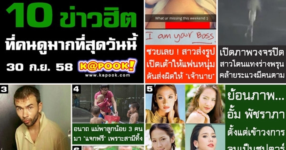 เรื่องที่คนส่วนใหญ่ให้ความสนใจมากที่สุดมาเป็นอันดับแรกในวันนี้เริ่มกันที่ ซวยเลย สาวส่งรูปเปิดเต้าให้แฟนหนุ่ม ดันส่งผิดให้ "เจ้านาย" ตามมาด้วย เปิดภาพวงจรปิด หญิงวัย 19 โดนแทงร่างพรุน พบหันหลังคล้ายระแวงมีคนตาม และ ดีเอสไอ เผยประสานตัว เณรคำ กลับไทยแล้ว รอสหรัฐฯ พิจารณา