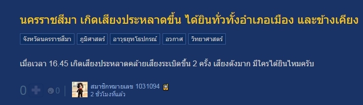วันที่ 1 ตุลาคม 2558 ผู้สื่อข่าวรายงานว่า คุณสมาชิกหมายเลข 1031094 สมาชิกเว็บไซต์พันทิปดอทคอม ได้มีการตั้งกระทู้สอบถาม เนื่องจากเมื่อเวลาประมาณ 16.45 น. ของวันนี้ ประชาชนในพื้นที่อำเภอเมือง จ.นครราชสีมา เกิดได้ยินเสียงประหลาดดั่งสนั่นทั่วเมือง คล้ายกับเสียงระเบิดดังขึ้นถึง 2 ครั้ง