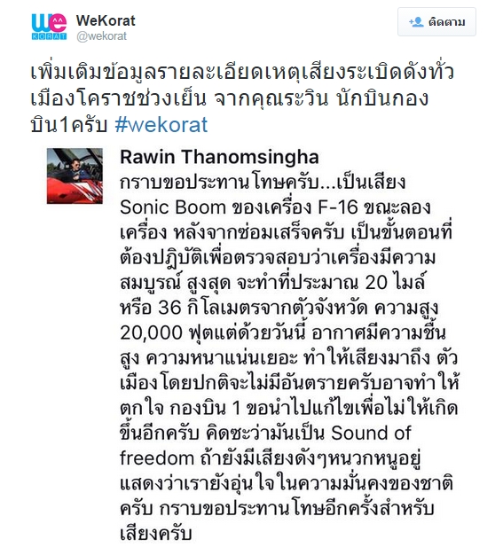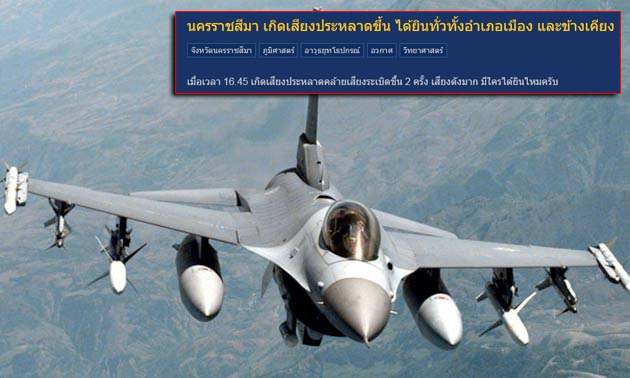 ชาวเน็ตแชร์ กรณีได้ยินเสียงประหลาดคล้ายระเบิดดั่งลั่นทั่วอำเภอเมืองโคราช และอำเภอใกล้เคียง สันนิษฐานเป็นเสียงโซนิคบูมจากเครื่องบินรบ F16