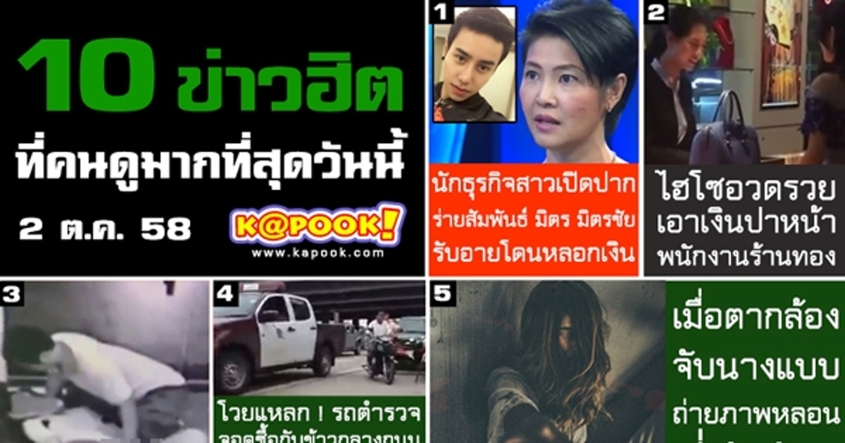 ข่าวฮิตประจำวันที่ 2 ตุลาคม 2558 กับข่าวนักธุรกิจสาวเปิดปากร่ายความสัมพันธ์ "มิตร มิตรชัย" รับอายโดนหลอกเงิน และข่าวฮอตอย่าง ชาวเน็ตจวก ไฮโซใหญ่อวดรวย เอาเงินปาหน้าพนักงานร้านทอง
