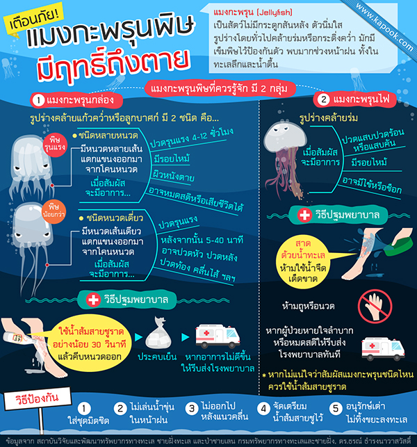 มาทำความรู้จักกับแมงกะพรุนพิษ พร้อมวิธีปฐมพยาบาลและวิธีป้องกันได้จากอินโฟกราฟิกด้านล่างนี้