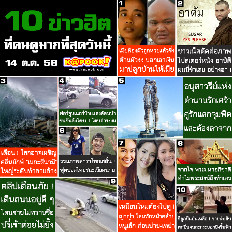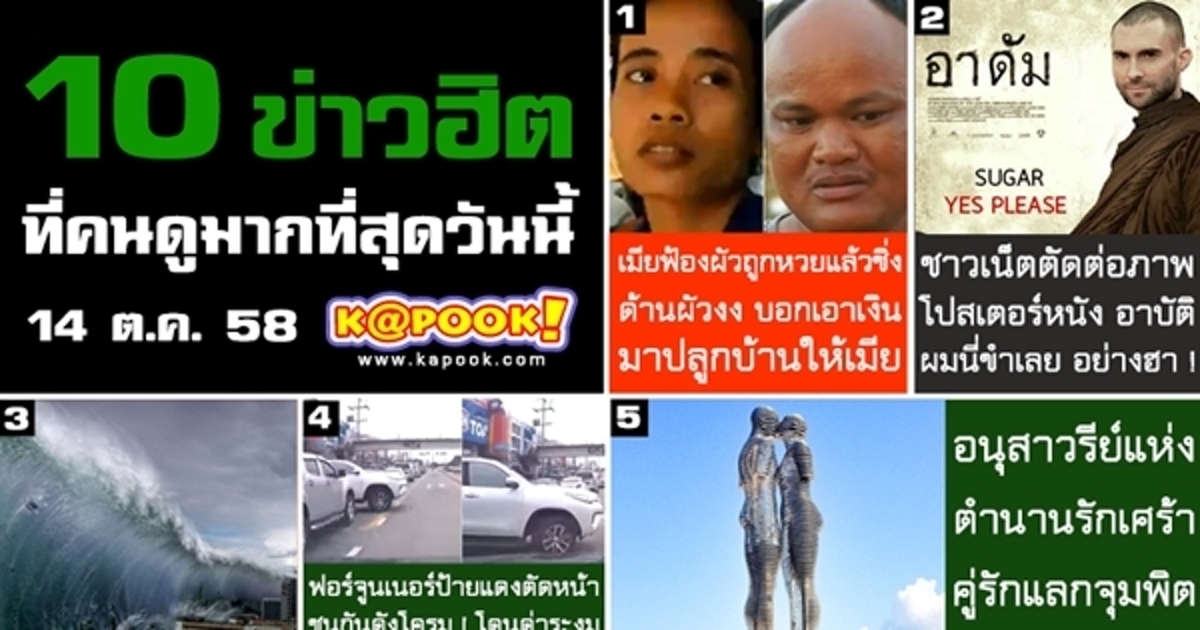 10 ข่าวฮิตวันที่ 14 ตุลาคม 2558 เมียฟ้องผัวถูกหวยแล้วชิ่ง ด้านผัวงง บอกเอาเงินมาปลูกบ้านให้เมีย และอย่างฮา ! ชาวเน็ตตัดต่อภาพโปสเตอร์หนัง อาบัติ ผมนี่ขำเลย