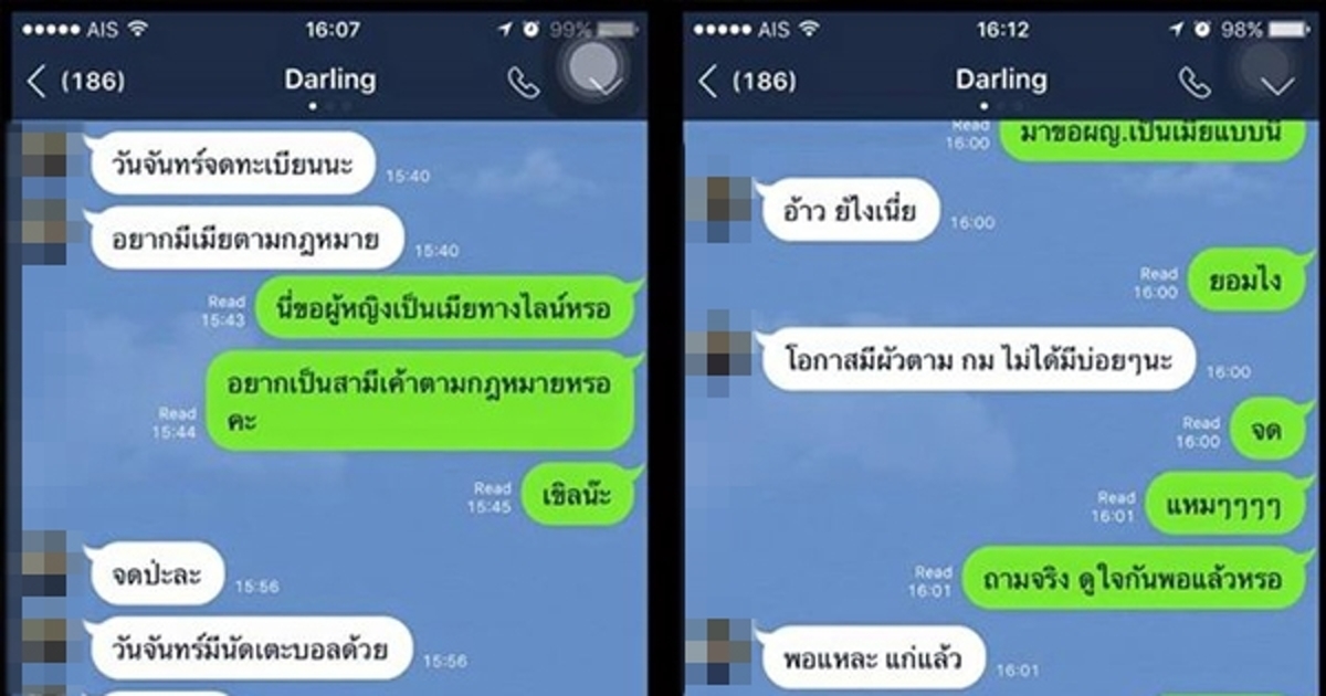 โดยเผยให้เห็นข้อความแชทของคู่รักสุดฮาร์ดคอร์ ที่จู่ ๆ ฝ่ายชายก็ทักว่า "วันจันทร์ไปจดทะเบียนนะ อยากมีเมียตามกฎหมาย" ฝ่ายหญิงเลยถามกลับว่า "นี่ขอผู้หญิงเป็นเมียทางไลน์เหรอ" แฟนหนุ่มเลยตอบกลับแบบชิล ๆ "จดป่ะล่ะ วันจันทร์มีนัดเตะบอลด้วยหลายงาน โอกาสมีผัวตามกฎหมายไม่ได้มีบ่อย ๆ นะ" งานนี้ฝ่ายสาวเลยตอบว่า "เถื้อน เถื่อน แต่ยอมไง จด" แถมยังแซวด้วยว่าดูใจกันแค่ 18 ปี มันไม่น้อยไปเหรอ