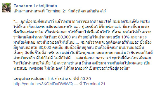 ทั้งนี้ เจ้าของเฟซบุ๊กดังกล่าว ได้มีการโพสต์อีกด้วยว่า สาเหตุที่ทางห้างไม่ทำศาลต่อ เพราะจุดนั้นมีคนผ่านประมาณ 80,000 คนต่อวัน ถ้าหากเกิดมีคนมาขอโชคลาภ แล้วได้ ตรงจุดนั้นจะกลายเป็นวุ่นวายทันที ส่งผลเสียต่อห้าง ขณะเดียวกัน หากเกิดขอแล้วไม่ได้ผล ห้างก็จะส่งผลเสียเช่นเดียวกัน