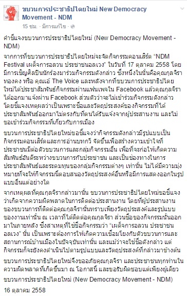 วันที่ 17 ตุลาคม 2558 ผู้สื่อข่าวรายงานว่า จากกรณีที่ ขบวนการประชาธิปไตยใหม่ได้เผยแพร่ข้อมูลผ่านทางเฟซบุ๊ก ขบวนการประชาธิปไตยใหม่ New Democracy Movement - NDM ระบุเชิญชวนร่วมงาน "NDM Festival เผด็จการอลวน ประชาชนอลเวง ในวันที่ 17 ตุลาคม 2558 กับมหกรรมดนตรี กวีศิลป์ท่ามกลางบรรยากาศชิว ๆ เป็นกันเอง โดยมีศิลปินนักร้อง อาทิ ฟลุ๊ค พชร ธรรมมล เอ้ เดอะว๊อยซื ฯ ที่อนุสรณ์สถาน 14 ตุลา