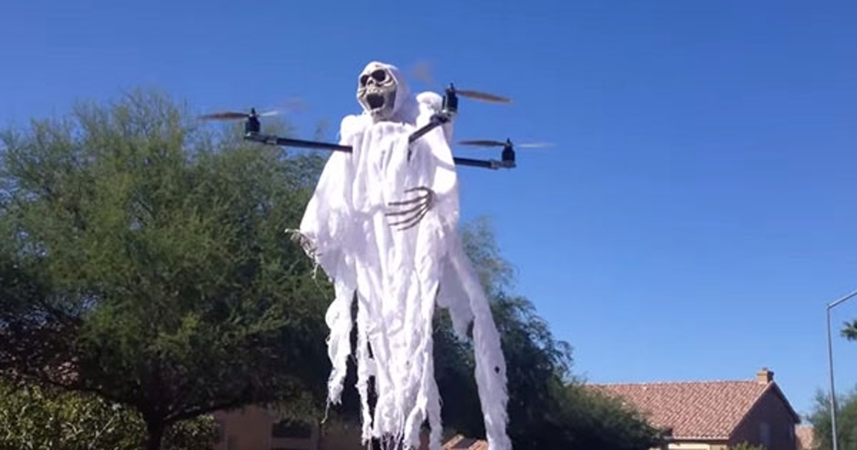 คลิปแสบรับฮาโลวีน เมื่อมีคนปิ๊งไอเดียเอาโดรนมาแปลงร่างเป็นผี ลอยไปลอยมาเหนือท้องฟ้ากลางถนนในเมือง ตอนกลางวันแสก ๆ ทำคนขับรถผ่านไป-มาตะลึงมึนงงกันยกใหญ่ วันที่ 19 ตุลาคม 2558 เว็บไซต์มิเรอร์ เผยคลิปชวนหลอนความยาวประมาณ 2 นาที จากสมาชิกเว็บไซต์ยูทูบชื่อว่า AZChopperCam จากคลิปปรากฏเป็นภาพของโดรนประดิษฐ์ชิ้นหนึ่ง ทว่ามีหน้าตาแตกต่างจากที่เคย ๆ เห็นกันทั่วไป เพราะมันถูกตกแต่งให้มีรูปร่างเหมือนกับภูตผี มีหัวกะโหลกติดอยู่ด้านบน ตัวเป็นผ้าสีขาว ๆ ขาดวิ่น ประกอบติดกับใบพัด 4 ใบ ลอยโฉบไปมากลางอากาศในบริเวณถนนแห่งหนึ่งในรัฐแอริโซนา สหรัฐฯ