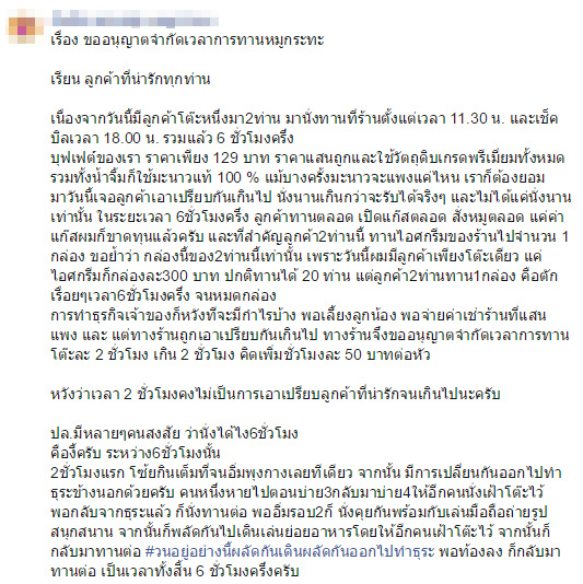 ร้านหมูกระทะเงิบ เจอลูกค้าหัวหมอนั่งทานร่วม 6 ชั่วโมง ฟาดไอศกรีมหมดกล่อง จนต้องออกมาตรการจำกัดเวลากิน แต่ผลกลับกลายเป็นโดนชาวเน็ตบางส่วนคอมเม้นท์โต้กลับว่าทางร้านไม่ได้จำกัดเวลาเอง และไม่ควรนินทาลูกค้า ขณะที่บางส่วนก็เข้าใจเห็นใจ มองว่าฝ่ายลูกค้าหัวหมอเกินไป