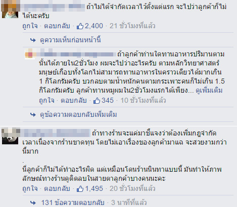 อย่างไรก็ตาม เหตุการณ์ดังกล่าว ได้สร้างความไม่พอใจแก่นักท่องเน็ตบางกลุ่มที่พบเห็นข้อความ เพราะมองว่า เป็นการนำพฤติกรรมลูกค้ามาแฉ ทั้งที่ไม่ได้ทำอะไรผิด รวมถึงทางร้านเองก็ไม่มีการจำกัดเวลาตั้งแต่แรก ก็ถือว่าไม่ผิดแต่อย่างใด บางส่วนก็เหน็บเจ้าของร้านว่า ถ้าใจไม่กว้างพอก็อย่ามาเปิดบุฟเฟ่ต์