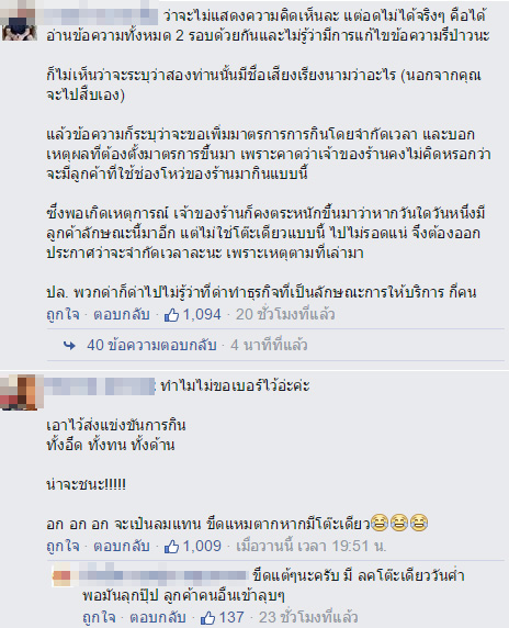 ขณะเดียวกัน ก็มีความเห็นอีกส่วนหนึ่งก็เห็นใจเจ้าของร้าน หลังเจอลูกค้าหัวหมอเข้าไป ซึ่งถ้าเกิดกรณีแบบนี้ขึ้นอีกก็ลำบากเช่นกัน และการประกาศจำกัดเวลาโดยแจ้งเหตุผลแบบนี้ก็ถือว่าเหมาะสมแล้ว
