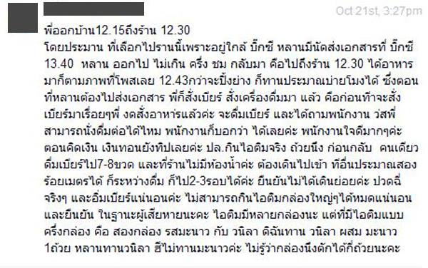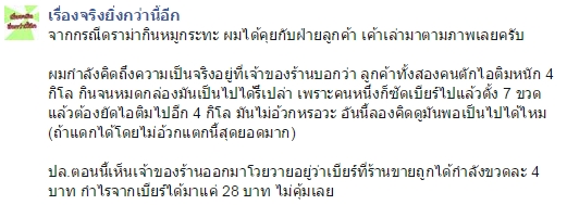 อย่างไรก็ตาม ล่าสุดเมื่อวันที่ 21 ตุลาคม 2558 เฟซบุ๊ก เรื่องจริงยิ่งกว่านี้อีก ได้มีการเขียนข้อความอ้างว่า เป็นข้อความจากลูกค้าร้านดังกล่าว ระบุว่า สาเหตุที่เดินออกนอกร้านระหว่างดื่ม ไม่ได้เป็นเพราะเดินย่อย แต่ที่ร้านไม่มีห้องน้ำ รวมถึงได้ดื่มเบียร์ประมาณ 7-8 ขวด ทำให้อิ่มเบียร์ ไม่สามารถกินไอศกรีมกล่องใหญ่ ๆ ตามที่ร้านระบุได้แน่นอน