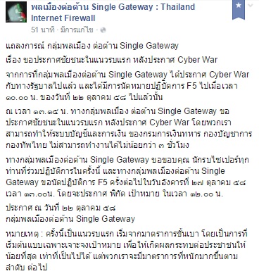 วันที่ 22 ตุลาคม 2558 ผู้สื่อข่าวรายงานว่า เพจเฟซบุ๊ก พลเมืองต่อต้าน Single Gateway : Thailand Internet Firewall ได้ออกแถลงการณ์ของกลุ่มโดยระบุหัวข้อ "ขอประกาศชัยชนะในแนวรบแรก หลังประกาศ Cyber War" ซึ่งมีใจความว่า จากการที่กลุ่มพลเมืองต่อต้าน Single Gateway ได้ประกาศสงครามไซเบอร์กับทางรัฐบาลไปแล้ว และได้นัดหมายปฏิบัติการ F5 ไปเมื่อเวลา 10.00 น. ของวันที่ 22 ตุลาคม 2558 จนกระทั่งเวลา 13.15 น. ทางกลุ่มขอประกาศชัยชนะในแนวรบแรก ด้วยการทำให้ระบบบัญชีและการเงิน ของกรมการเงินทหาร กองบัญชาการกองทัพไทย ไม่สามารถทำงานได้น้อยกว่า 3 ชั่วโมง
