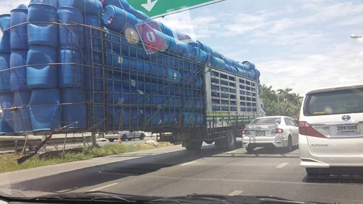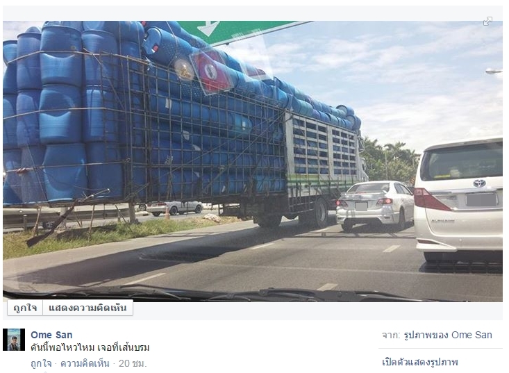 วันที่ 22 ตุลาคม 2558 ผู้สื่อข่าวรายงานว่า ขณะนี้ในโลกสังคมออนไลน์มีการแชร์ภาพที่กำลังเป็นที่พูดถึง ที่โพสต์โดยเฟซบุ๊ก Ome San เผยให้เห็นภาพรถบรรทุกเล็กคันหนึ่งที่บรรทุกเอาถังพลาสติกสีน้ำเงินจำนวนมาก จนยื่นล้นออกมาทางด้านท้ายของรถ จนเกิดเป็นข้อสงสัยและมีการตั้งคำถามตามมาว่าเจ้าหน้าที่ปล่อยให้ออกมาขับบนท้องถนนได้อย่างไร มันผิดกฎหมายบรรทุกเกินขนาดไม่ใช่หรือ ? จนทำให้เจ้าของภาพต้องถ่ายแล้วเอามาแชร์