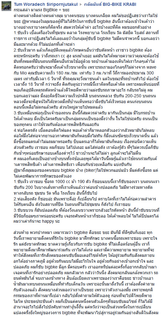 อย่างไรก็ดี ล่าสุดวันที่ 23 ตุลาคม 2558 เฟซบุ๊กของคุณ Tum Woradech Siripornjutakul ได้โพสต์ข้อความผ่านกรุ๊ป กลัดมันส์ BIG-BIKE KRABI เผยถึงมุมมองของตนเอง กับกระแสสังคมที่กำลังวิพากษ์วิจารณ์บิ๊กไบค์กันอย่างมากมาย