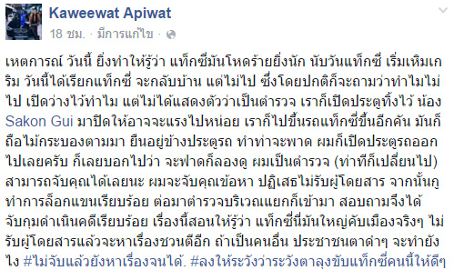 เมื่อวันที่ 24 ตุลาคม 2558 เฟซบุ๊ก Kaweewat Apiwat มีการเขียนข้อความเล่าเหตุการณ์เกี่ยวกับแท็กซี่ไทย หลังจากที่ตัวเองโดนปฏิเสธรับผู้โดยสารว่า ได้เรียกแท็กซี่คันหนึ่ง แต่แท็กซี่กลับไม่ยอมไปส่ง จึงได้ปิดประตูรถคันดังกล่าวซึ่งอาจจะแรงเกินไป ทำให้คนขับแท็กซี่ถือไม้กระบองตามมา หมายทำร้ายเจ้าของเฟซบุ๊ก อย่างไรก็ตาม เมื่อเจ้าของเฟซบุ๊ก เปิดเผยว่าตัวเองเป็นตำรวจ คนขับแท็กซี่ก็มีท่าทีอ่อนลง ก่อนถูกตำรวจจราจรเข้ามาจับกุมและดำเนินคดีต่อไป