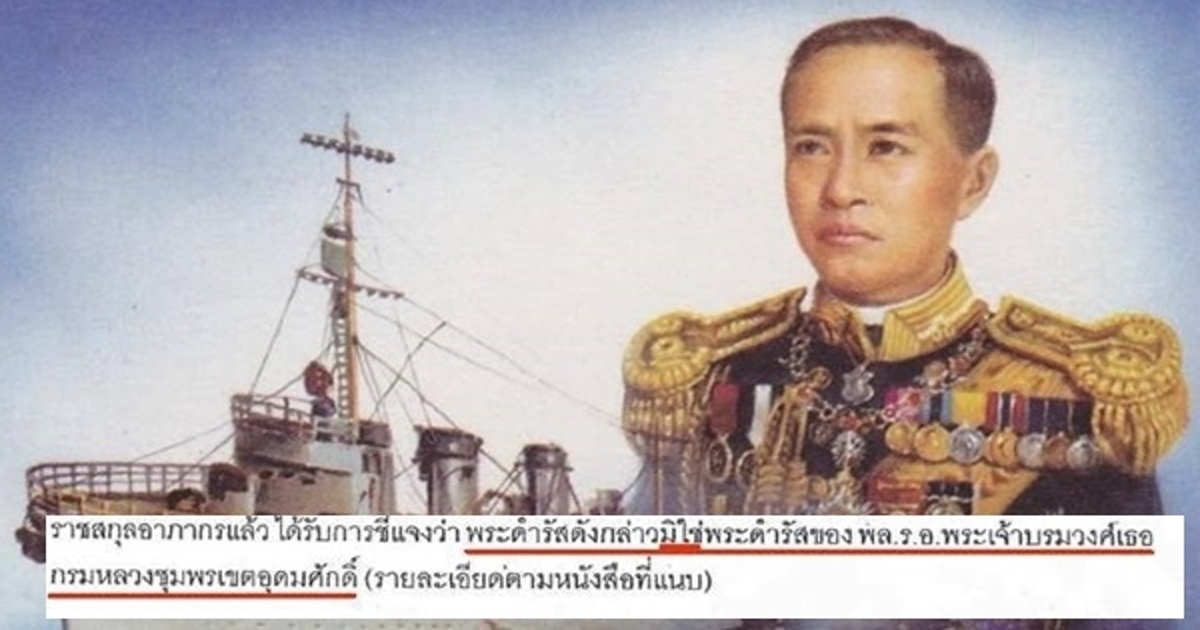 ล่าสุด ได้มีสำเนาบันทึกข้อความ เผยแพร่จากสำนักงานเลขานุการกองทัพเรือ (สลก.ทร.) กองประชาสัมพันธ์ เรื่องการตรวจสอบคำพระดำรัสของ พล.ร.อ. พระเจ้าบรมวงศ์เธอ กรมหลวงชุมพรเขตอุดมศักดิ์ ซึ่งจากการตรวจสอบของ สลก.ทร. ได้ชี้แจงว่า พระดำรัสดังกล่าว มิใช่พระดำรัสของ พล.ร.อ. พระเจ้าบรมวงศ์เธอ กรมหลวงชุมพรเขตอุดมศักดิ์ จึงเสนอมาเพื่อทราบ และประชาสัมพันธ์ให้ข้าราชการและประชาชนรับทราบทั่วกัน