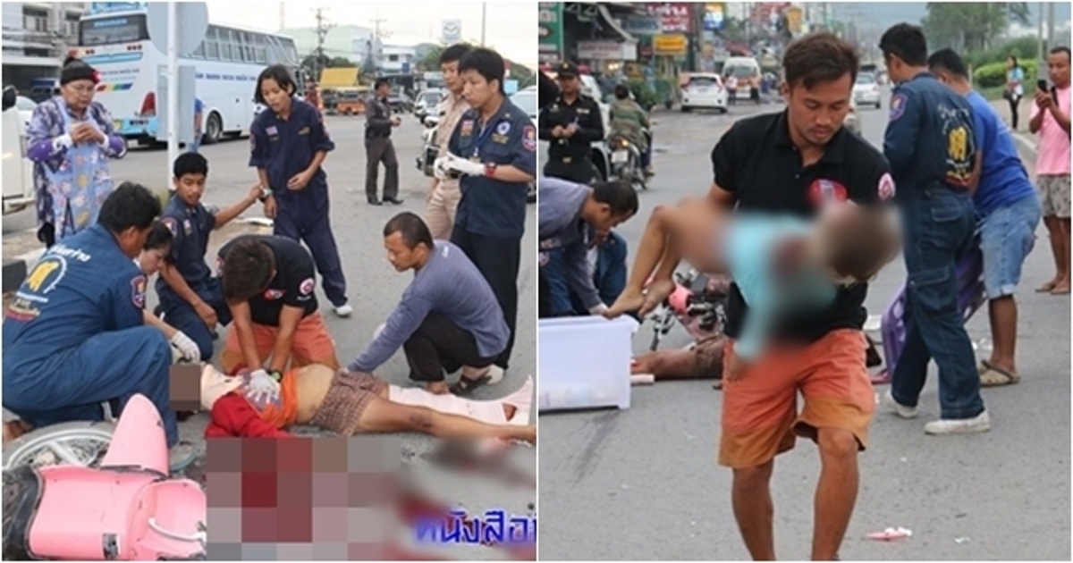 เกิดอุบัติเหตุหญิงวัย 50 ปี ขี่รถจักรยานยนต์ซ้อนหลาน 3 คน ฝ่าไฟแดง ใน อ.สัตหีบ จ.ชลบุรี ถูกรถเก๋งของครูสาวพุ่งชนเสียชีวิต บาดเจ็บสาหัส 3 ราย