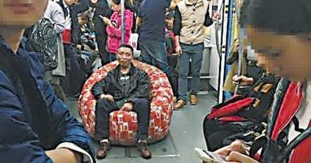 วันที่ 18 พฤศจิกายน 2558 เว็บไซต์เซี่ยงไฮ้อิสต์ เผยภาพถ่ายจากรถไฟฟ้าใต้ดินที่เห็นแล้วอดอึ้งไม่ได้ เมื่อมีชายชาวจีนคนหนึ่งช่างกล้า หอบเบาะบีนแบ็กส่วนตัวขึ้นไปวางกลางรถไฟใต้ดิน แล้วนั่งอย่างสง่าประหนึ่งเจ้าพ่อ ใครจะโหนราวจับก็โหนไป ใครจะเบียดเสียดกันแล้วยังไงเล่า ผมสบายสุด ๆ เป็นพอแล้ว