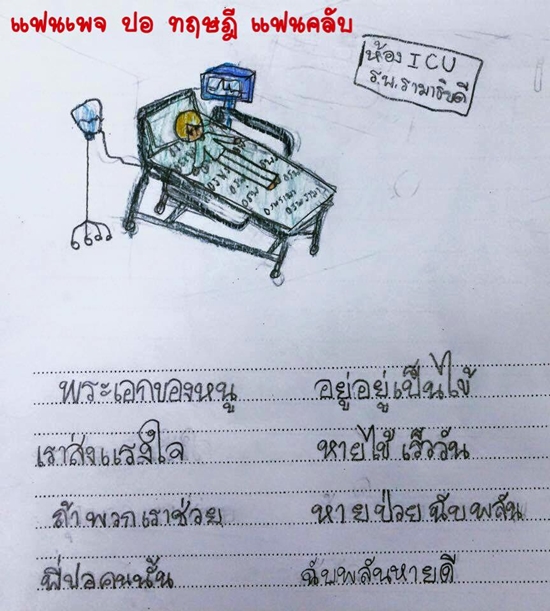 เป็นภาพน่ารัก ๆ และกลอนเพราะ ๆ ที่อ่านแล้วอดยิ้มตามไม่ได้เลยล่ะค่ะ สำหรับเหล่าบรรดาแฟนคลับตัวจิ๋วของ "ปอ ทฤษฎี สหวงษ์" ที่ตอนนี้กำลังเข้ารับการรักษาจากอาการป่วยไข้เลือดออกที่โรงพยาบาลรามาธิบดี