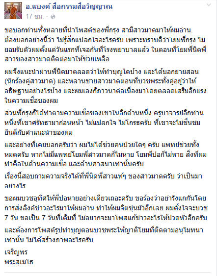 อ.แบงค์ สื่อกรรม บอกแพทย์ต่างหากที่ช่วย สาวมาด เมกะแดนซ์ หลังก่อนหน้านี้เคยโพสต์อ้างว่าตัวเองเป็นคนช่วย ด้านชาวเน็ตถามบวชอยู่ควรเล่นโซเชียลไหม