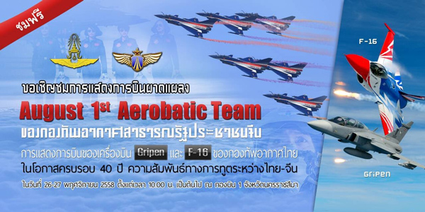 กองบิน 1 โคราช ชวนชมการแสดงการบินผาดแผลงร่วมกันระหว่าง F-16, กริพเพน และ August 1st Aerobatic Team เนื่องในโอกาสครบรอบ 40 ปี ความสัมพันธ์ทางการทูตไทย-จีน 26-27 พฤศจิกายนนี้