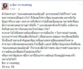 จากกรณีทหารได้ควบคุมตัว นายจตุพร พรหมพันธุ์ และนายณัฐวุฒิ ใสยเกื้อ 2 แกนนำ นปช. ขณะกำลังเดินทางไปยังอุทยานราชภักดิ์ (อ่านข่าว คสช. แจงคุมตัว ณัฐวุฒิ-จตุพร เหตุปลุกปั่น เข้าข่ายเคลื่อนไหวทางการเมือง)