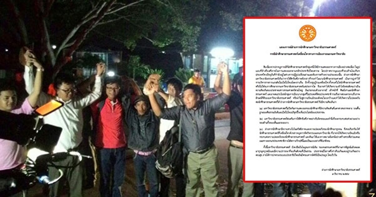 และล่าสุด วันนี้ (9 ธันวาคม 2558) เฟซบุ๊ก Chalie Charoenlarpnopparut ได้เผยแพร่แถลงการณ์ของฝ่ายการนักศึกษามหาวิทยาลัยธรรมศาสตร์ เรื่อง "กรณีนักศึกษาธรรมศาสตร์เคลื่อนไหวทางการเมืองภายนอกมหาวิทยาลัย" โดยมีใจความระบุว่า