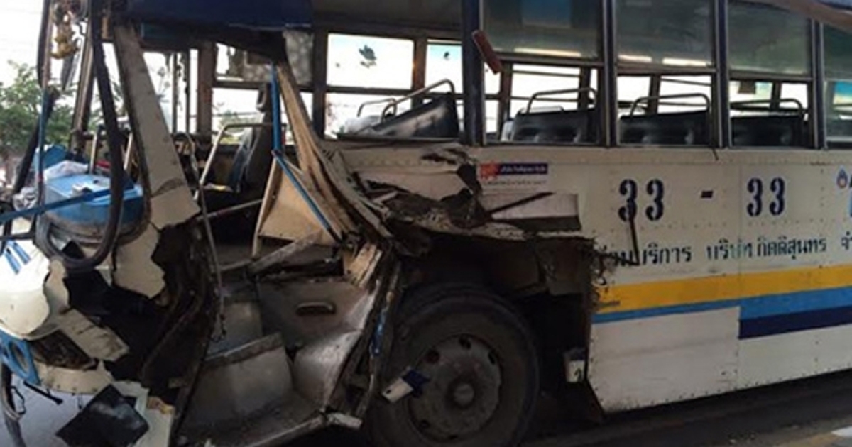 รถพ่วงขนขยะเบรกกะทันหัน ทำรถเมล์สาย 33 ที่ตามหลังมาเบรกไม่อยู่ พุ่งชนท้าย ผู้โดยสารเจ็บระนาว
