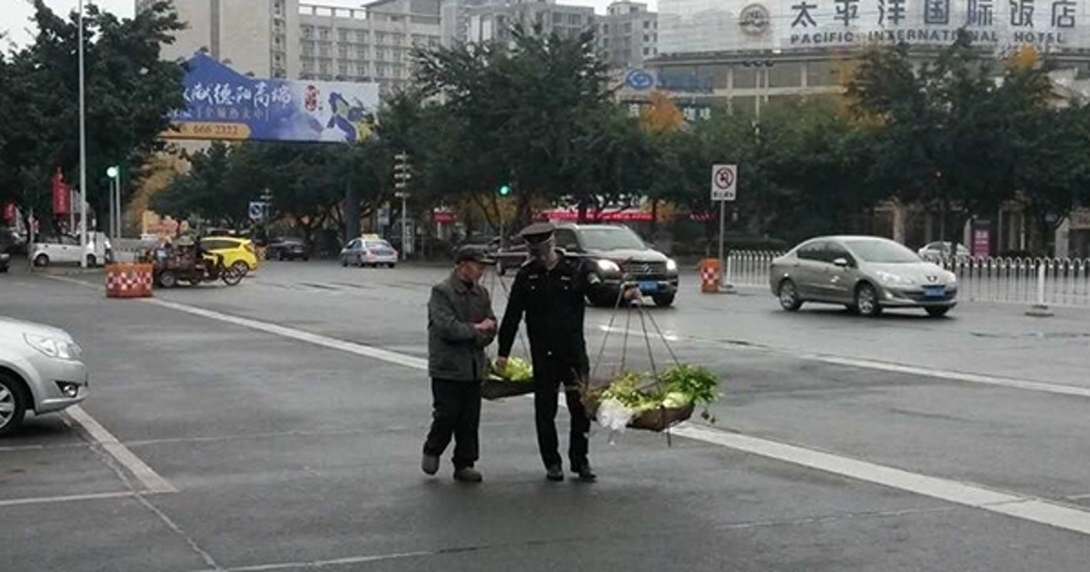 วันที่ 14 ธันวาคม 2558 สำนักข่าว CCTV ของจีน เปิดเผยข่าวและภาพชวนประทับใจ เมื่อตำรวจท้องถิ่นมณฑลเสฉวน ได้แสดงออกถึงความมีน้ำใจต่อเพื่อนมนุษย์ ด้วยการช่วยชาวนาอายุมากรายหนึ่งแบกตะกร้าหาบเร่ที่มีผักอยู่เต็ม ก่อนจะเดินเท้าไปส่งชาวนาและผลผลิตที่เขาตั้งใจนำมาขายในตลาด โชคดีมีผู้พบเห็นเหตุการณ์ระหว่างทาง จึงถ่ายภาพชวนซาบซึ้งใจนี้มาโพสต์ลงในโลกออนไลน์