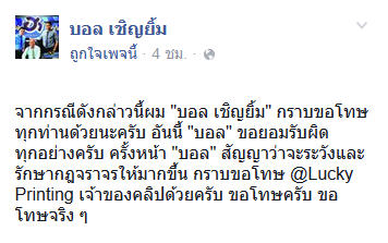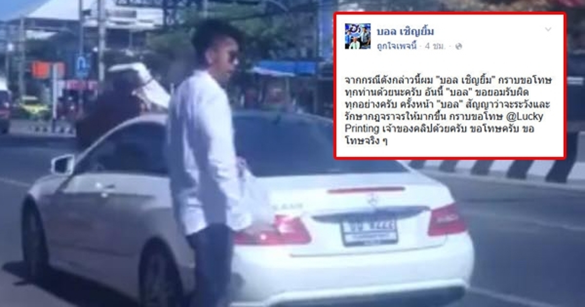 ต่อมา เฟซบุ๊ก บอล เชิญยิ้ม มีการโพสต์ขอโทษต่อเจ้าของคลิปดังกล่าว ที่ผิดกฎจราจรครั้งนี้ ซึ่งชาวเน็ตก็ได้ให้กำลังใจ และชื่นชมที่ยอมรับผิด