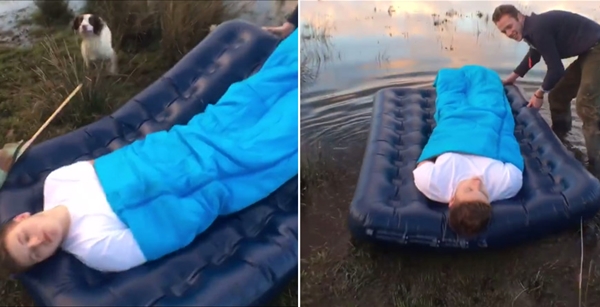 หนุ่มไอเดียบรรเจิด อัดคลิปแกล้งเพื่อนแบบแสบสันสุด ๆ ด้วยการลากเพื่อนที่หลับสนิทไม่ไหวติงบนเตียงลมลงน้ำ แล้วปล่อยให้นอนสบายกลางทะเลสาบ ก่อนที่เจ้าตัวจะตื่นมาสบถดังลั่น