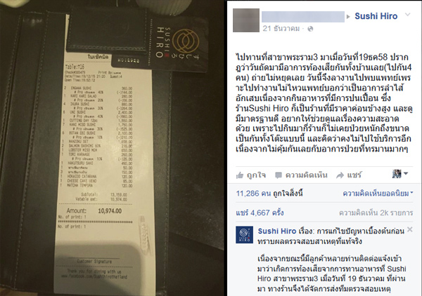 เกิดเป็นกรณีที่ถูกวิพากษ์วิจารณ์เป็นอย่างมากในสังคมออนไลน์และหมู่นักชิม เมื่อวันที่ 21 ธันวาคม 2558 มีผู้ใช้เฟซบุ๊กท่านหนึ่งได้ออกมาร้องเรียนกรณีที่ตนเองและครอบครัวได้ไปใช้บริการร้านซูชิแห่งหนึ่งย่านพระราม 3 เมื่อวันที่ 19 ธันวาคมที่ผ่านมา หมดค่าอาหารไปร่วมหมื่น แต่ปรากฏว่าวันถัดมากลับท้องเสียกันทั้งบ้าน จนต้องลางานไปพบแพทย์ ซึ่งแพทย์ระบุว่านี่เป็นอาการลำไส้อักเสบเนื่องจากการทานอาหารที่มีการปนเปื้อน ซึ่งเป็นเหตุที่ไม่น่าจะเกิดขึ้นกับร้านซูชิชื่อดังแห่งนี้ เพราะเป็นร้านที่มีราคาสูง สมควรจะดูแลด้านความสะอาดให้มีมาตรฐานกว่านี้