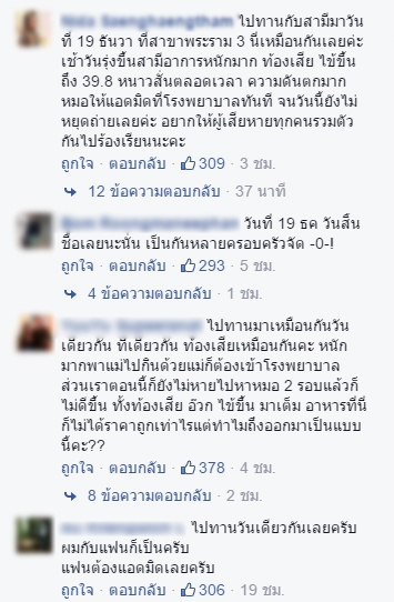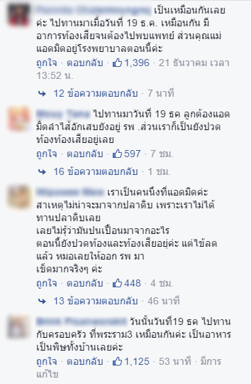 และเป็นที่สร้างความตกใจมากขึ้น เมื่อมีผู้ใช้โซเชียลอีกจำนวนไม่น้อยที่เข้ามาเปิดเผยว่า ไม่เพียงแค่เจ้าของเรื่องข้างต้นเท่านั้นที่ประสบเหตุดังกล่าว เพราะพวกเขาต่างก็มีอาการท้องเสีย อาหารเป็นพิษ และหลายรายมีอาการหนักถึงขั้นต้องแอดมิทในโรงพยาบาลเช่นกัน หลังเข้าไปทานอาหารที่ร้านซูชิที่สาขาเดียวกัน ในวันเดียวกันนั้น